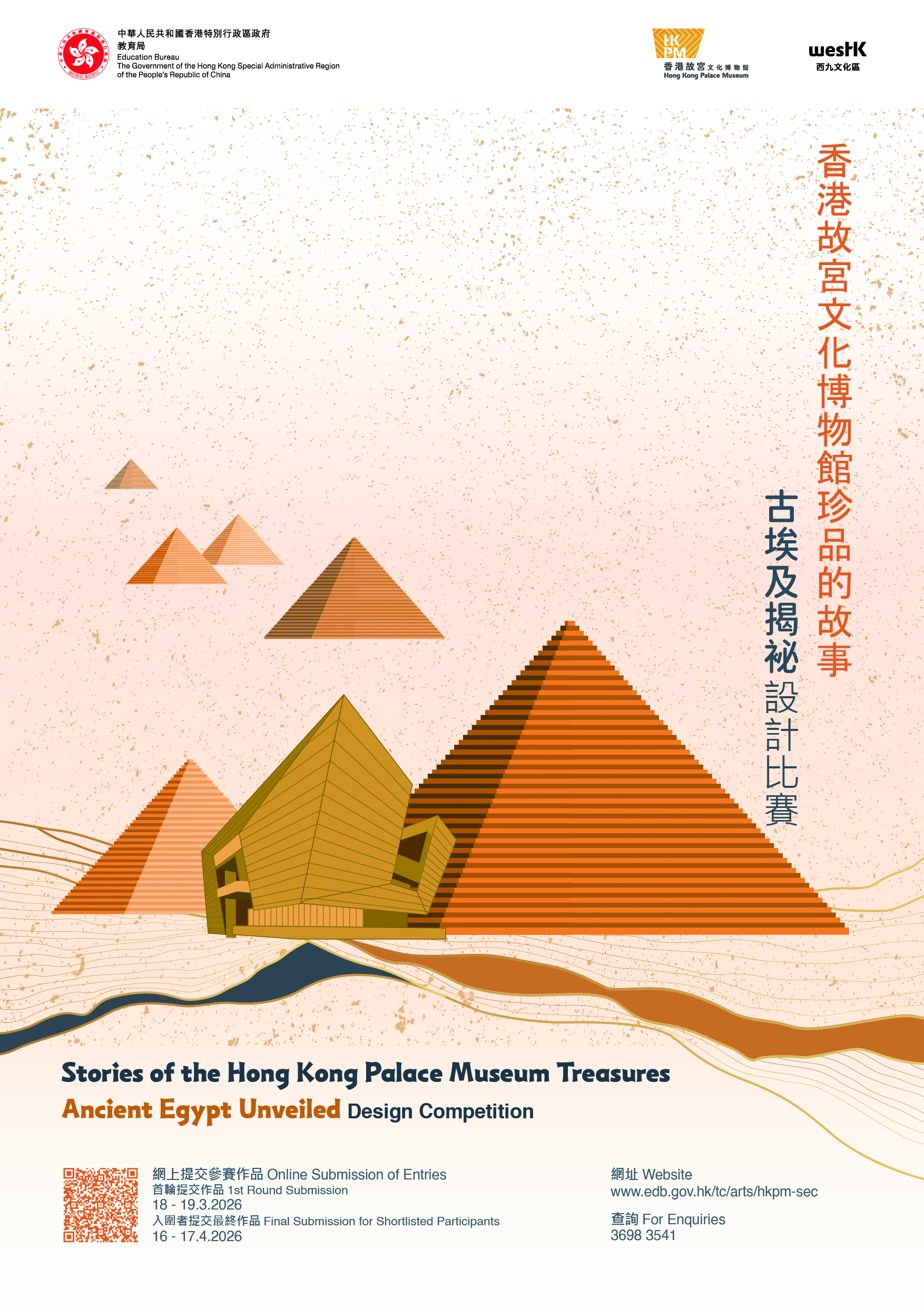 |  | Stories of the Hong Kong Palace Museum Treasures –"Ancient Egypt Unveiled" Design Competition (Secondary) 2025/26 The competition aims to encourage secondary students to to design creative images inspired by the Ancient Egyptian treasures on display at the HKPM and cultivate their aesthetic sensibility, creativity, appreciation of the parallel development of ancient Egyptian and Chinese civilisations, as well as positive values and attitudes towards cross-cultural exchange between East and West.