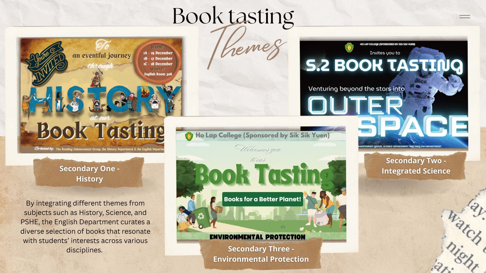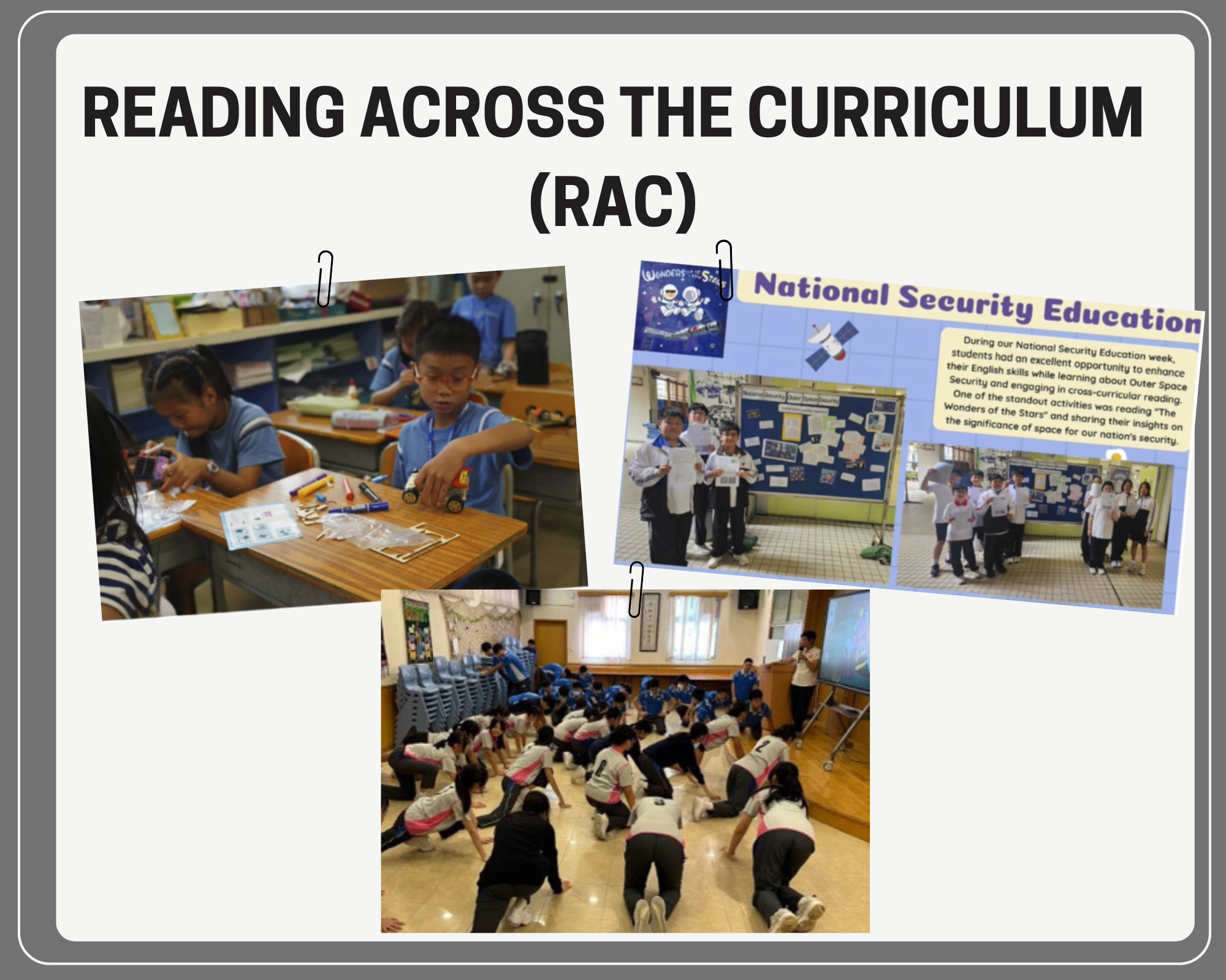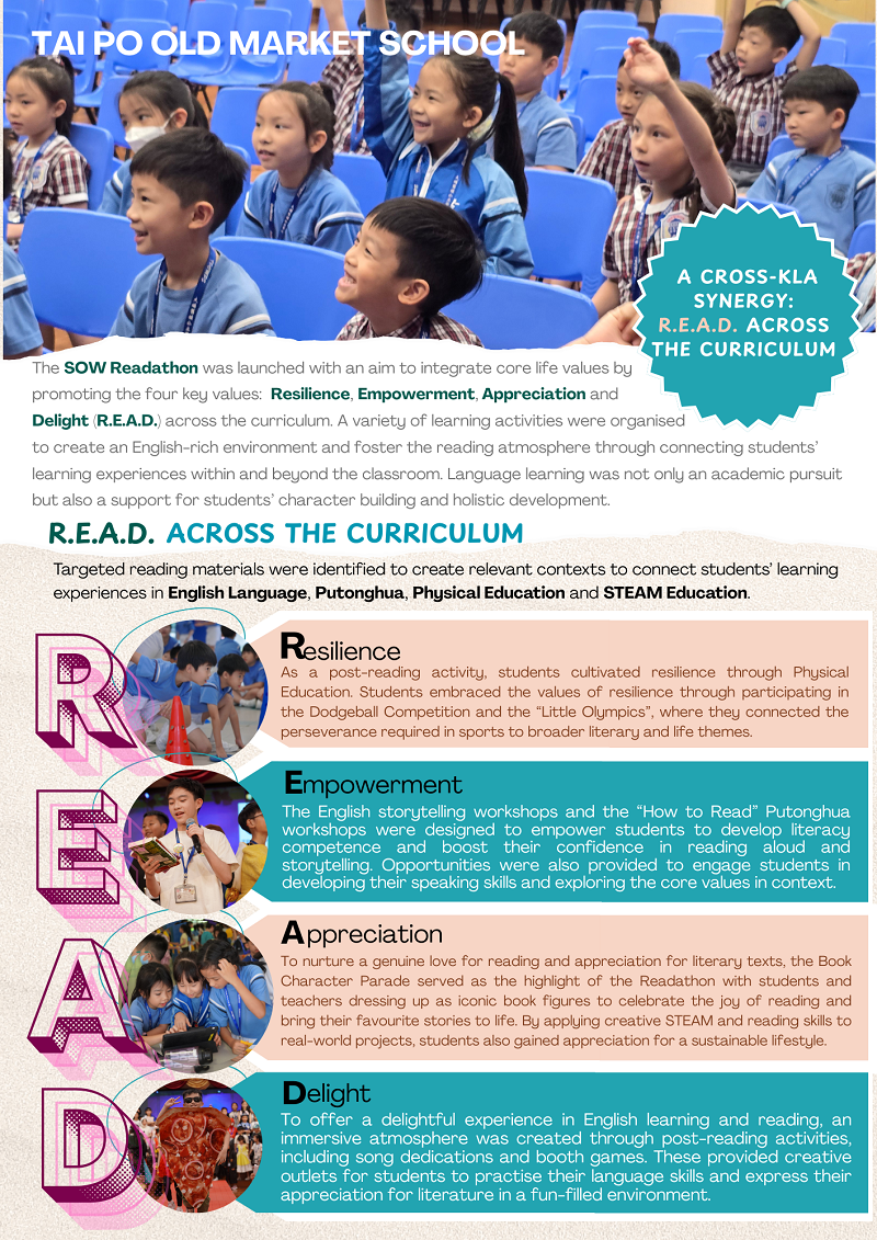Reading across the Curriculum (RaC) was promoted in the school curriculum to connect students' learning experiences (e.g. Physical Education, STEAM Education, National Security Education, History) across the curriculum. Relevant contexts and post-reading activities (e.g. debates, creative tasks, projects) were designed to extend students' learning experiences beyond the classroom. By leveraging subject-specific topics, students were guided to integrate different subject knowledge and construct knowledge of the world, thereby paving the way for lifelong learning.
