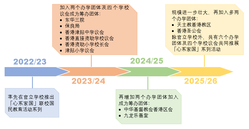 教育局在2022/23学年率先在官立学校推出「心系家国」联校国民教育活动系列。活动推行至今,已发展成为学界标志性的国民教育活动,并得到办学团体、学校议会和持份者参与和支持,促进学界和不同持份者的协作,发挥协同效应。由2025/26学年起,「心系家国」系列活动会恒常化和普及化,全力在学界以跨办学团体和跨校形式推动爱国主义教育,进一步加强学生的国民身份认同和文化自信。