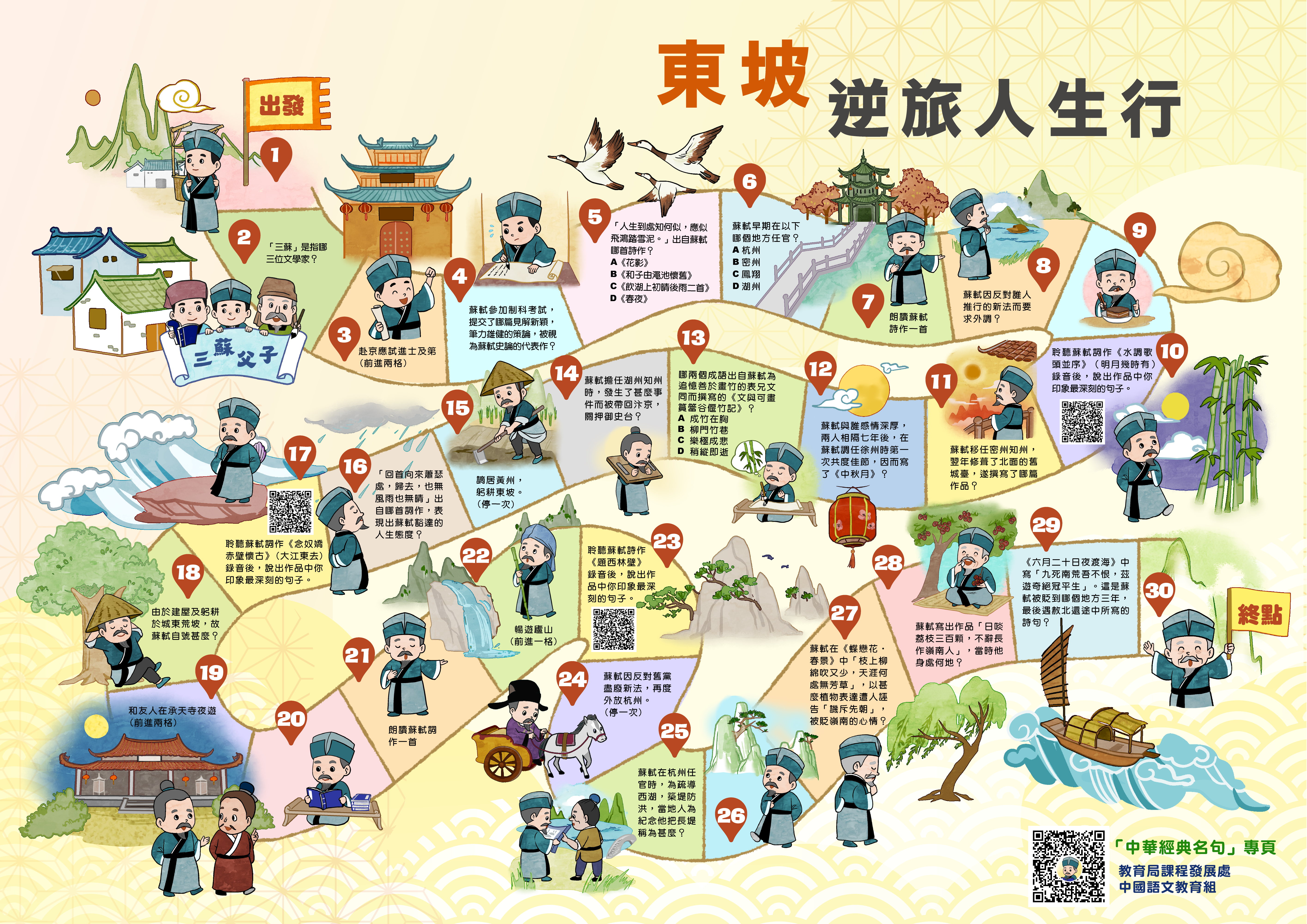 「東坡逆旅人生行」遊戲圖,將蘇軾跌宕起伏的一生濃縮於方寸棋盤之間,透過趣味互動的形式,引領學生重踏這位文豪充滿詩意與挑戰的人生逆旅。遊戲內容豐富,涵蓋蘇軾的家世背景、經典名篇、仕途遭遇、生活逸聞等,希望幫助學生從遊戲中學習,認識蘇軾及其文學作品。