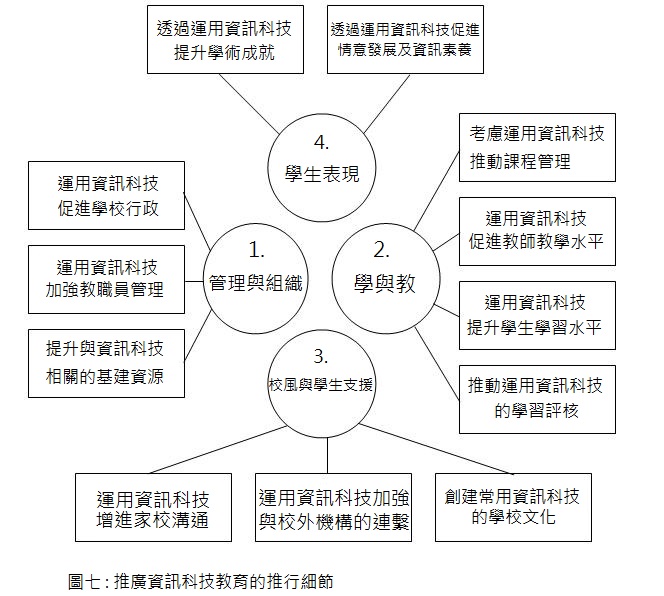 為了配合本地學界的學校發展與問責措施的推行,我們建議學校在推行校本資訊科技教育發展計劃時參考下列4個範疇: