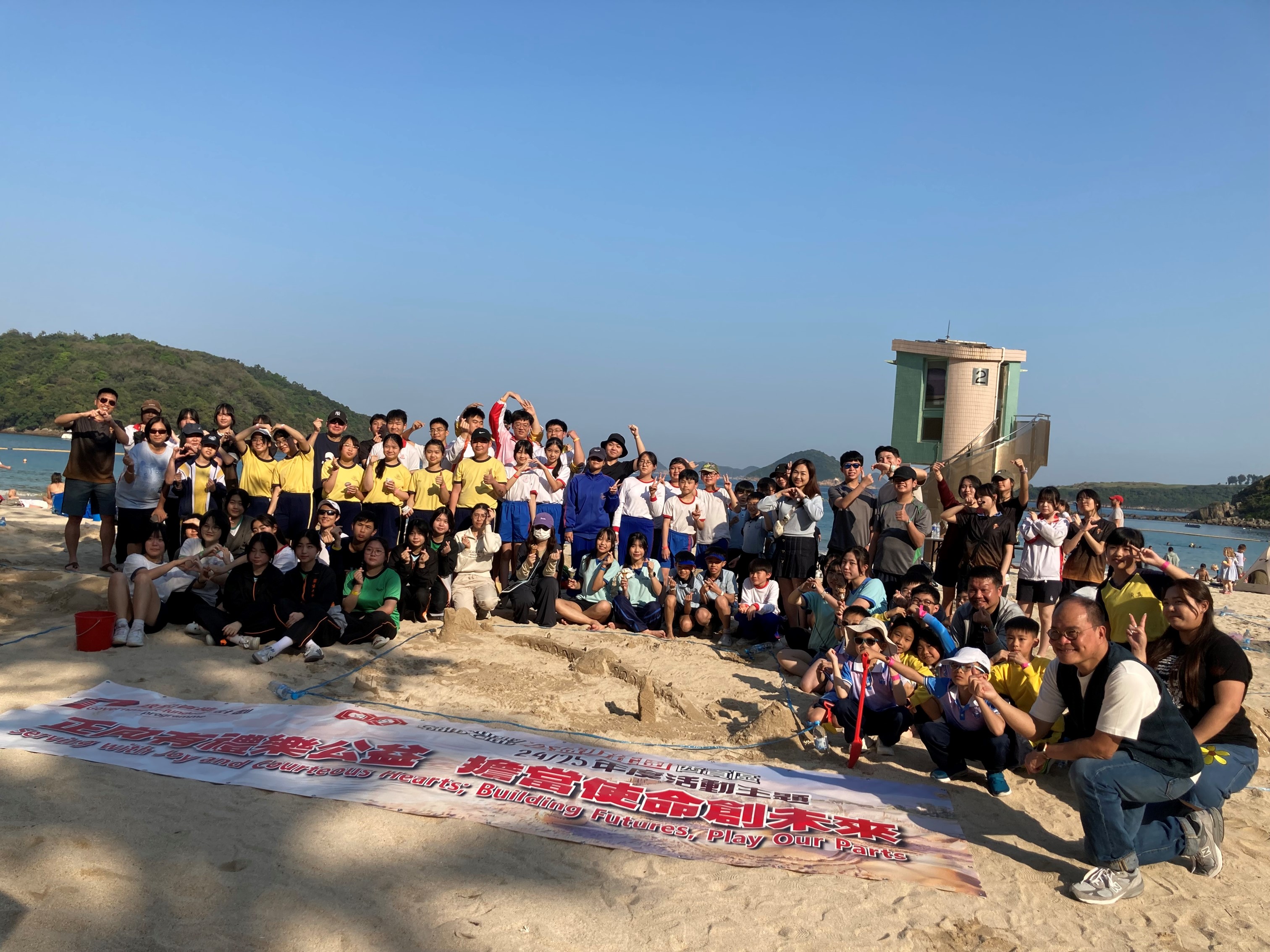 | 活動內容: | 為配合公益少年團年度活動主題「正向有禮樂公益 擔當使命創未來 」,團員以堆沙表達有禮、關懷老幼的信息。 |