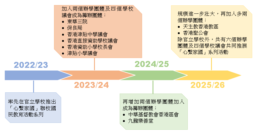 教育局在2022/23學年率先在官立學校推出「心繫家國」聯校國民教育活動系列。活動推行至今,已發展成為學界標誌性的國民教育活動,並得到辦學團體、學校議會和持份者參與和支持,促進學界和不同持份者的協作,發揮協同效應。由2025/26學年起,「心繫家國」系列活動會恆常化和普及化,全力在學界以跨辦學團體和跨校形式推動愛國主義教育,進一步加強學生的國民身份認同和文化自信。